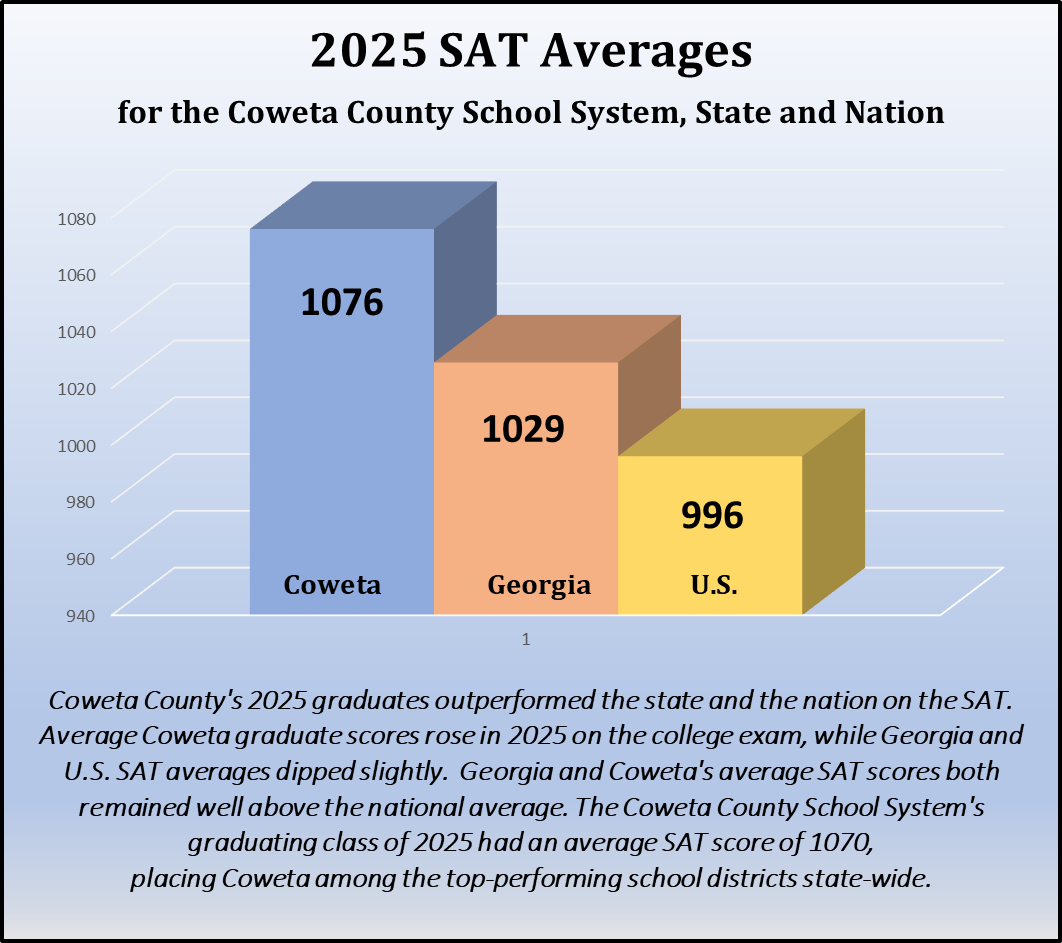 This year, system-wide performance on the SAT college entrance exam placed the Coweta County School System in about the top 15 percent of mean SAT scores among the 182 Georgia school districts reporting in 2025.