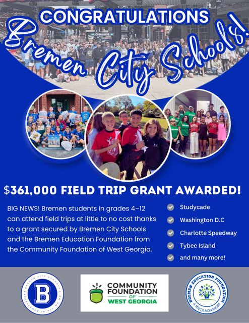 Bremen City Schools students will soon have more opportunities to explore the world beyond the classroom, thanks to a $361,000 field trip grant awarded by the Community Foundation of West Georgia.