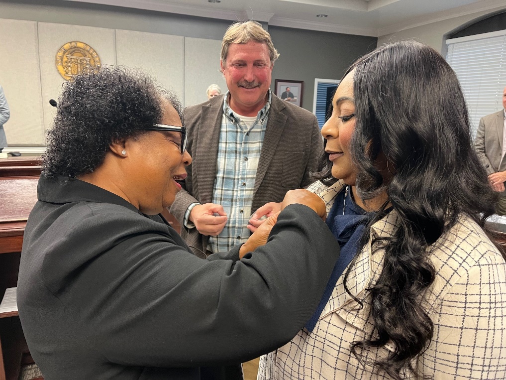 Cumming’s mom places the 25-year pin on her jacket as Mayor Arrington looks on.