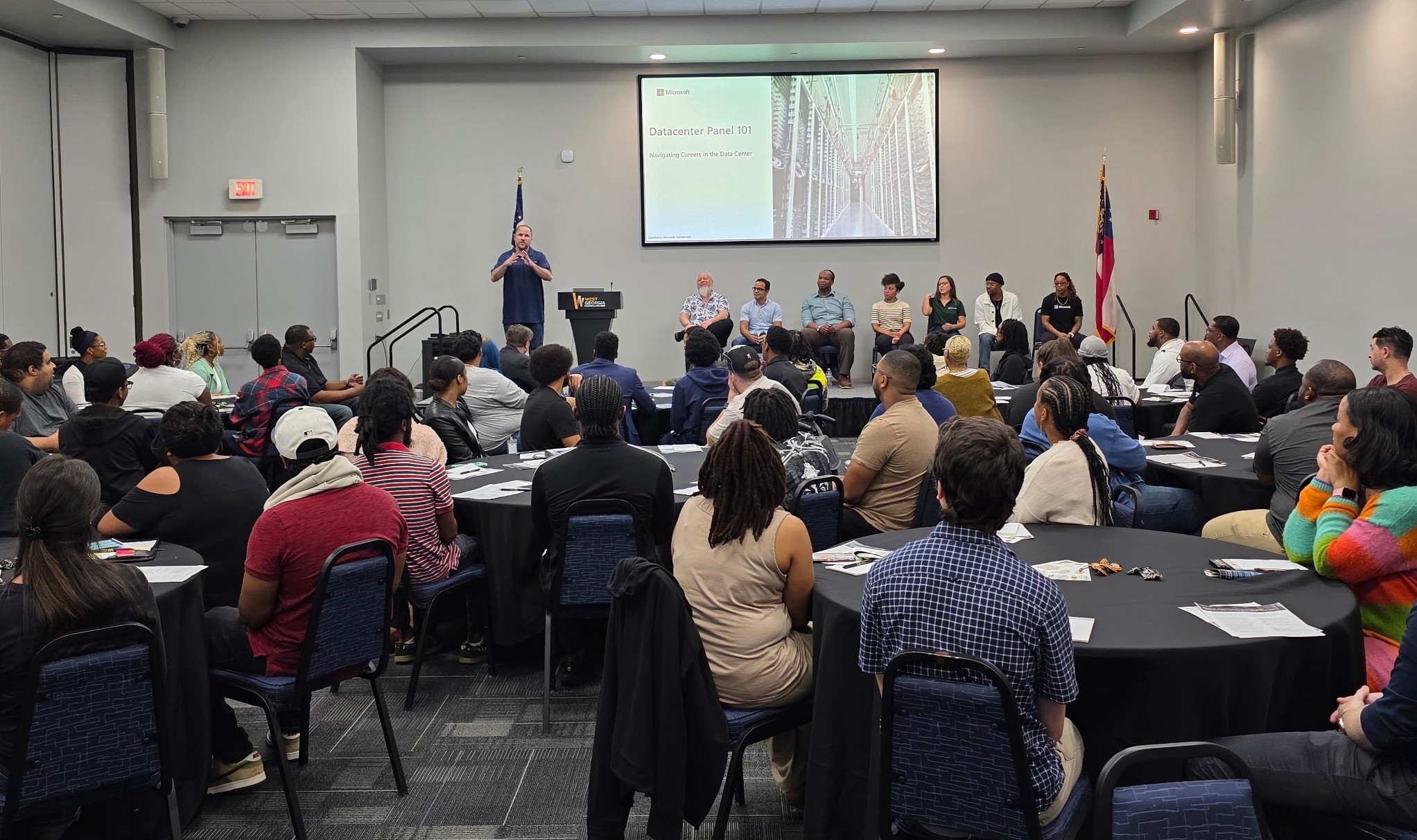 Students listen to a panel of Microsoft professionals during the Microsoft Career Networking Event at WGTC’s Douglas Campus on March 10, where nearly 100 participants