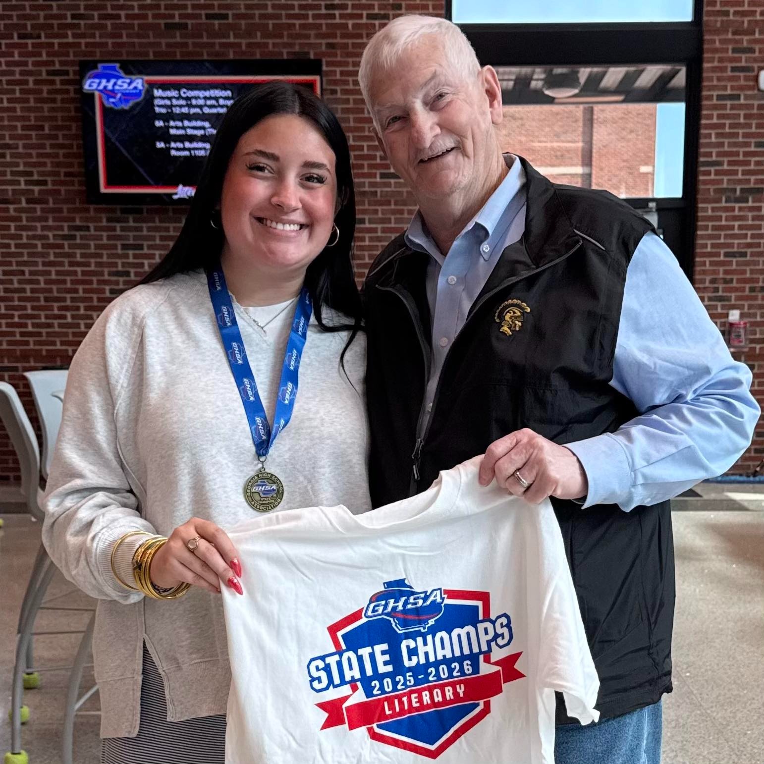CHS junior Presley McLaren (left) is pictured with Coach Richard Bracknell (right) after claiming the GHSA Literary State Championship in the Extemporaneous Speaking– Domestic category.