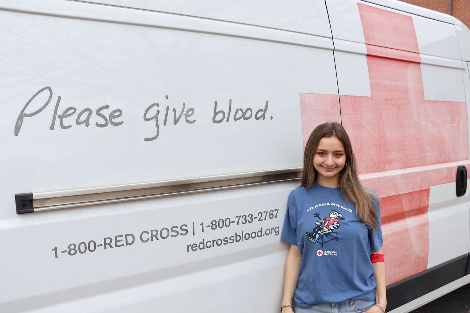 CHS senior Julia Hume is pictured after her donation appointment, in front of the American Red Cross van advertisement for donors, at the blood drive