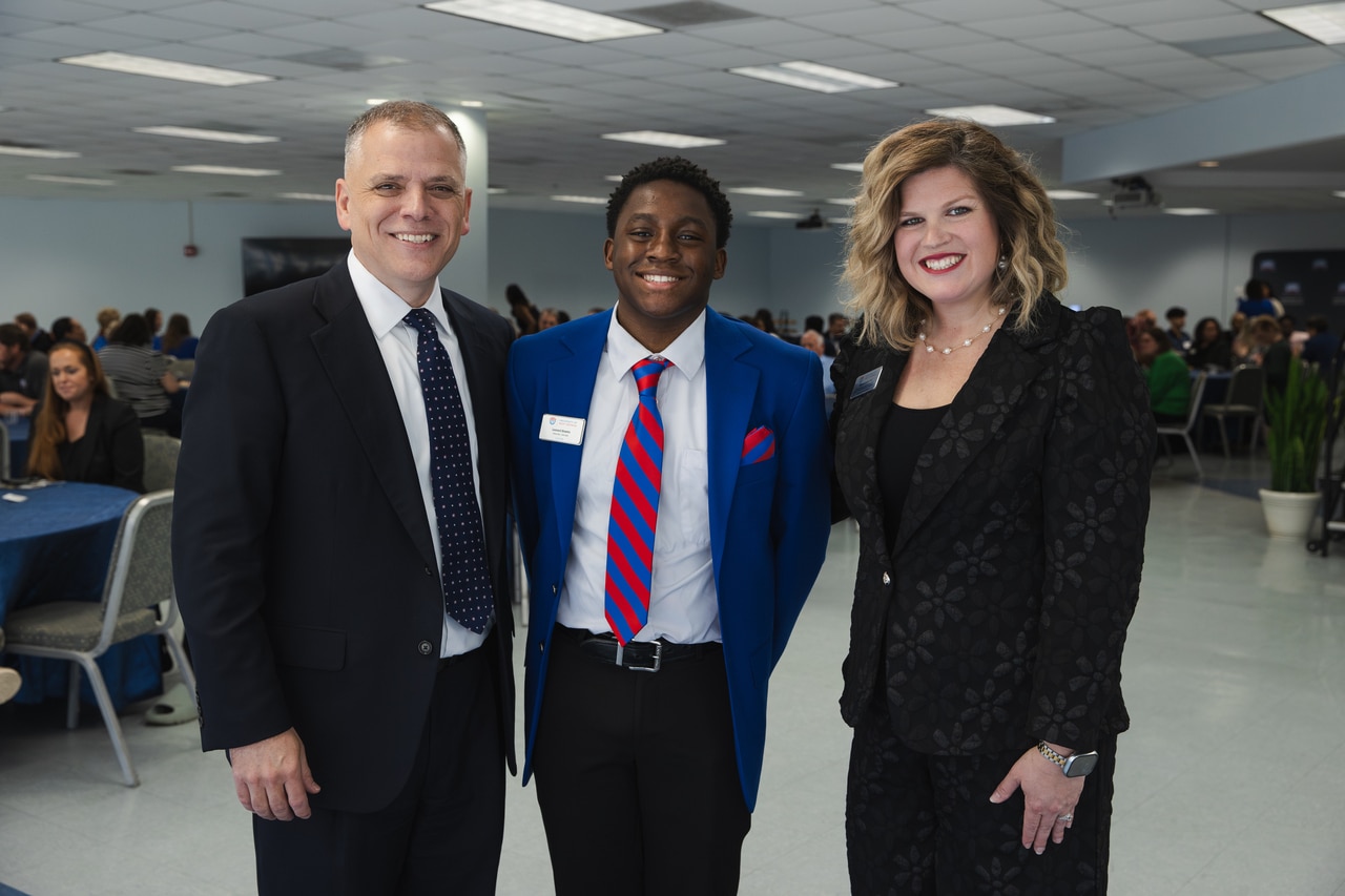 L to R: Dr. Michael Johnson, UWG president; Leonard Bowles, UWG student and scholarship recipient; and Allyson Bretch, vice president for university advancement and CEO