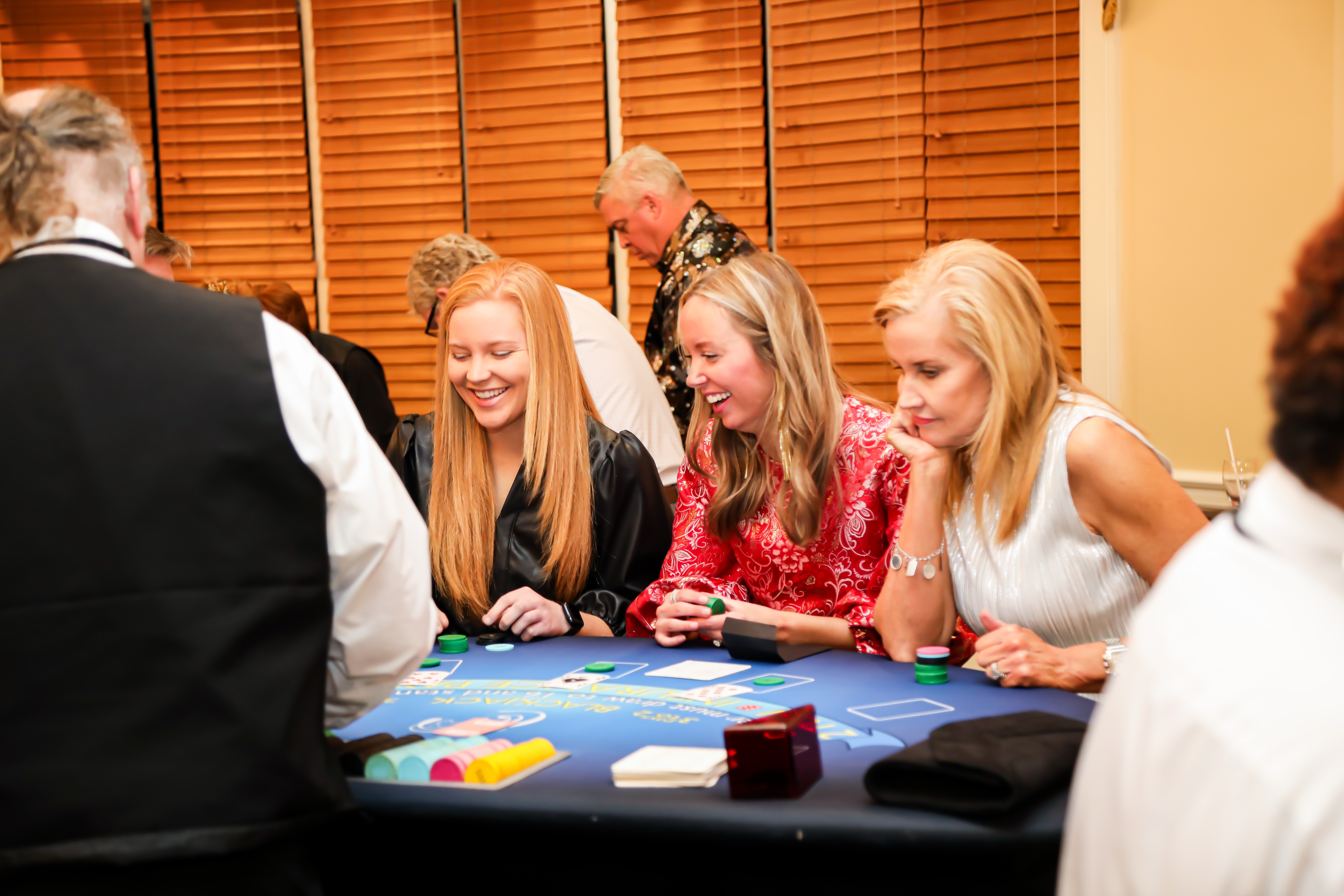 From left, Sydney Stone, Taylor Grisham and Kay Stone enjoy a game at the blackjack table during the 2025 Carrollton Dawnbreaker’s Casino Night fundraiser, an