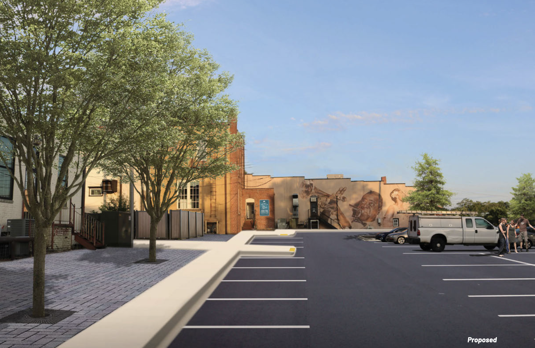 Photo of proposed changes from the city of Carrollton Work Session agenda for Feb 19 The rear parking area behind the northeastern quadrant of Adamson